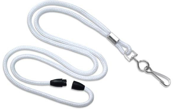 White Round Standard Lanyard with Breakaway & Nickel-Plated Steel Swivel-Hook. Most Economical Lanyard. 1/8" (3 mm) Round; 36" (914) Cut Length Prior to Assembley & Comes with a White Breakaway. Quantity of 100.
