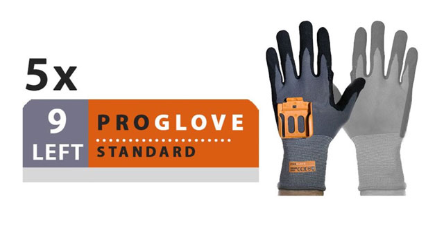 Proglove standard glove wearables are for areas with lower-level protection requirements for gloves. Left or right version is available, textile trigger located on the side of the index fingers. Designed for small parts, high bay warehouse picking, tugger trains, etc.